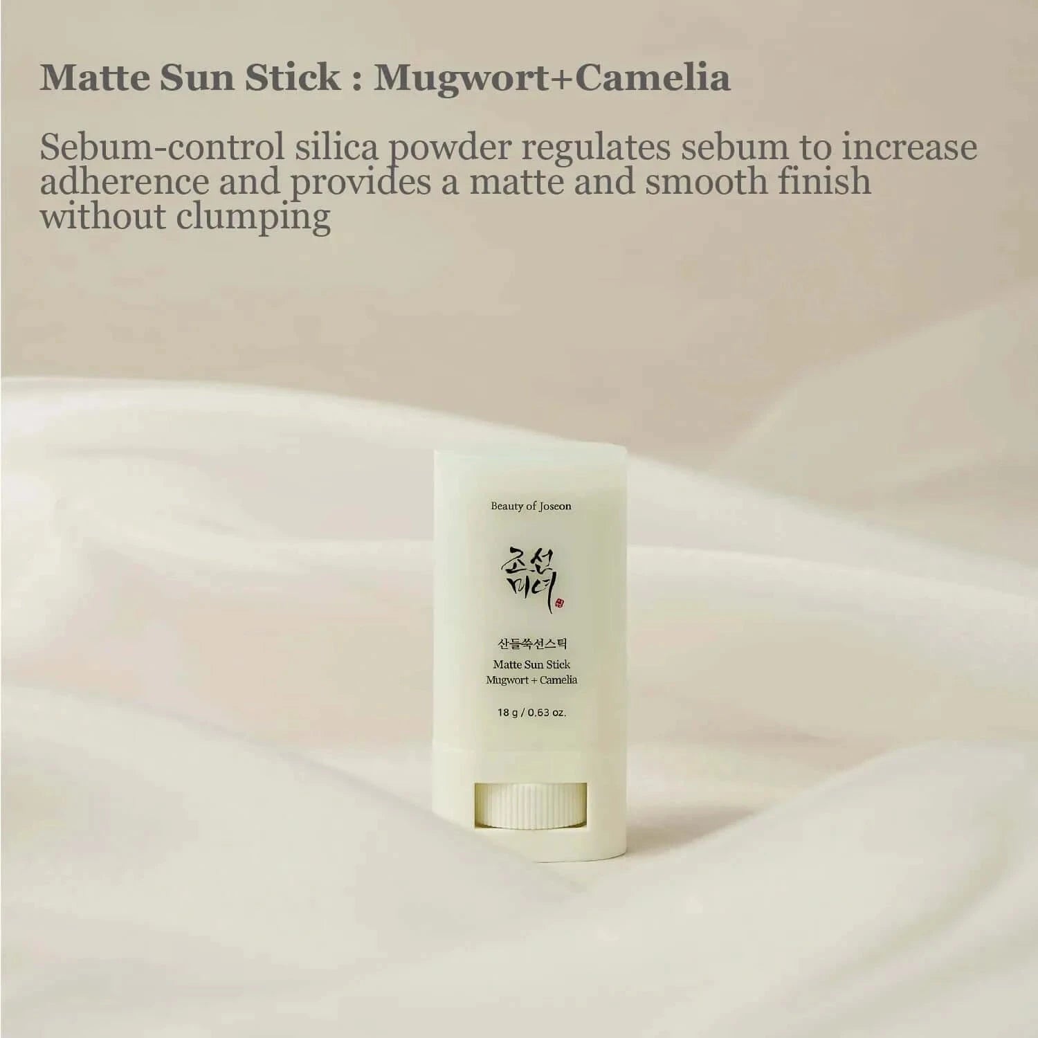Beauty of Joseon Matte sun stick: Mugwort + Camellia on innovatiivinen aurinkosuojapuikko, joka antaa mattapinnan ja sisältää pujo- ja kameliauutteita. Tuote tarjoaa erittäin korkean suojan SPF50+ PA++++ auringon haitallisia säteitä vastaan, ehkäisee pigmenttiläiskiä ja ihon ennenaikaista ikääntymistä.