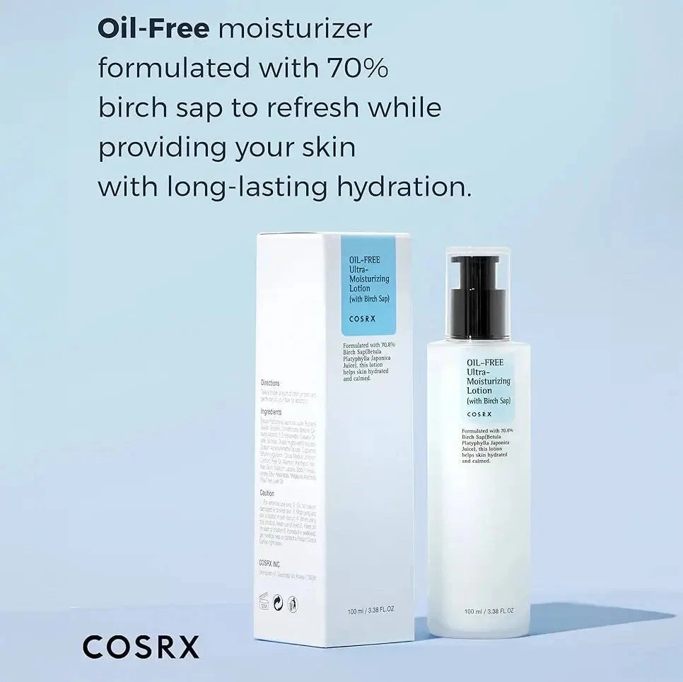 COSRX Oil Free Ultra Moisturizing Lotion, joka sisältää 70 % koivunmahlaa, on tarkoitettu sekaiholle, rasvoittuvalle ja herkälle iholle. Tämä öljytön voide kosteuttaa syvältä, rauhoittaa ihoa ja omaa antibakteerisia ominaisuuksia. Sen kevyt koostumus imeytyy nopeasti jättämättä rasvaista tai tahmeaa tunnetta. Tuote parantaa ihon pH-tasapainoa, vähentää kuivuutta ja hilseilyä, säätelee talineritystä, poistaa tulehduksia ja punoitusta, torjuu aknea ja lisää ihon kimmoisuutta.