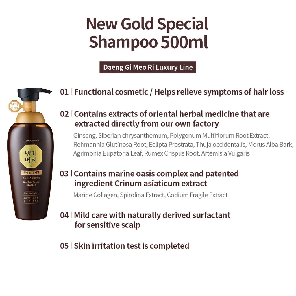 Daeng Gi Meo Ri New Gold Special Shampoo on syväpuhdistava ja hiusjuuria vahvistava shampoo, joka poistaa ylimääräisen talin, pölyn, epäpuhtaudet, kuolleet ihosolut ja muotoilutuotteiden jäämät, jättäen hiukset puhtaiksi ja raikkaiksi.