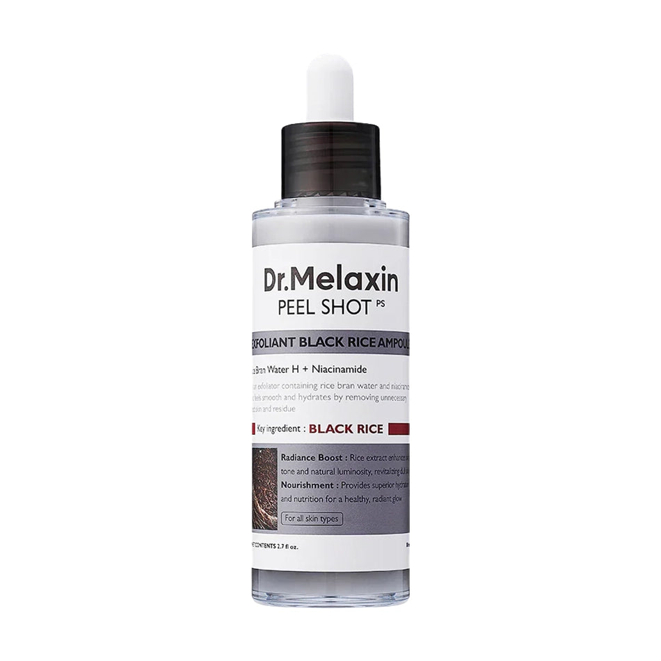 Dr.Melaxin Peel Shot Exfoliant Black Rice Ampoule on ravitseva kuoriva seerumi, joka kirkastaa, tasoittaa ja palauttaa ihon luonnollisen hehkun mustan riisin uutteella.