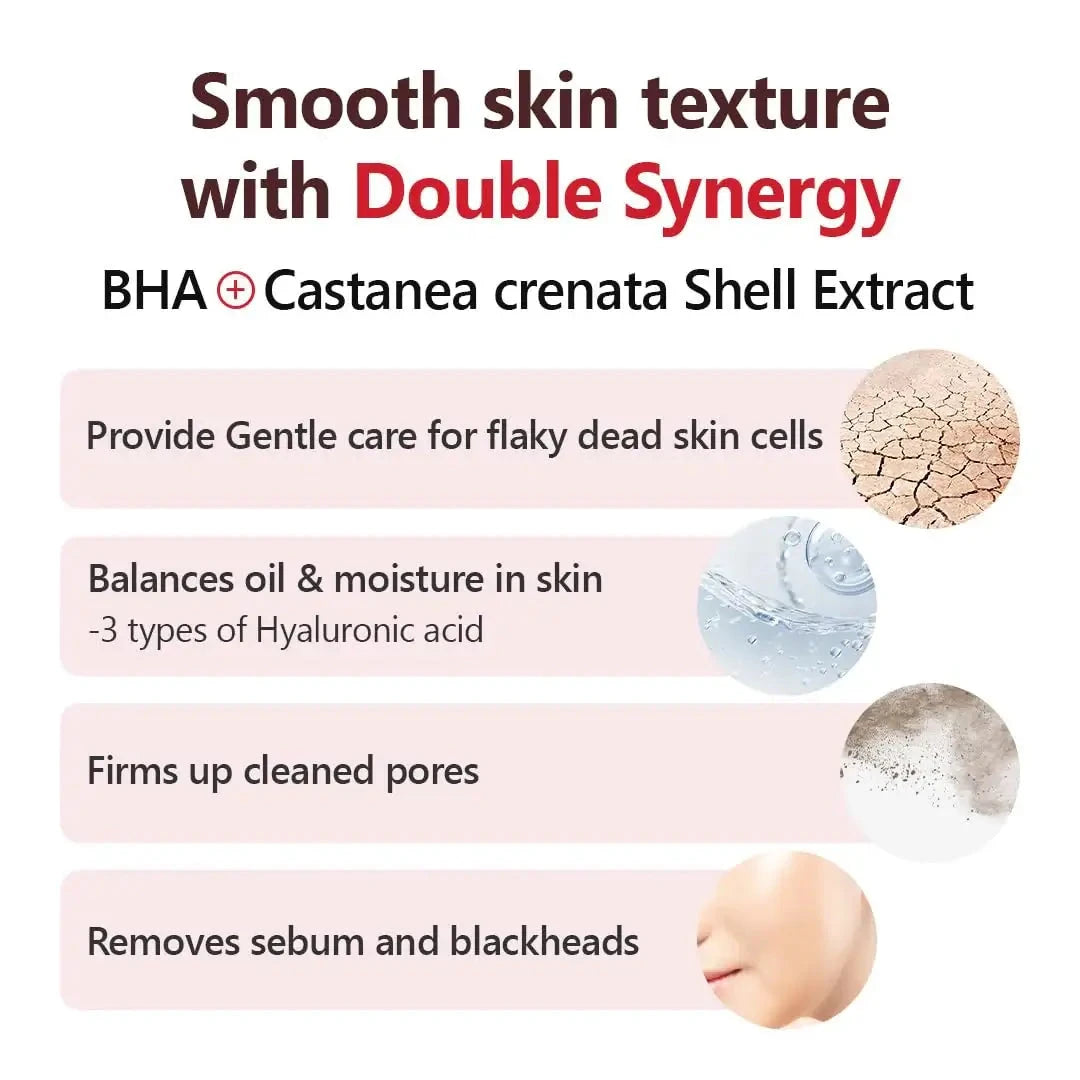 Tämä kevyt ja tehokkaasti kuoriva toner sisältää 2 % salisyylihappoa, joka puhdistaa ihohuokoset syvältä ja poistaa kuollutta ihosolukkoa. Kastanjankuoriuute tasapainottaa talintuotantoa ja parantaa ihon sävyä, jolloin iho näyttää tasaisemmalta ja raikkaammalta. Koostumusta täydentää hyaluronihappo, joka kosteuttaa ja vahvistaa ihon kosteustasapainoa ilman kiristävää tunnetta. Hellävarainen, alkoholiton ja hajusteeton koostumus sopii myös herkälle iholle.