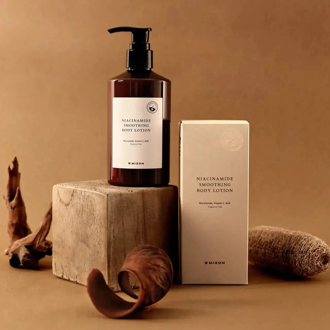 Mizon Niacinamide Smoothing Body Lotion on tehokkaasti kosteuttava ja kirkastava vartalovoide, joka auttaa vähentämään pigmentaatiota ja tasoittamaan ihon sävyä. Sopii kaikille ihotyypeille, myös herkälle iholle.