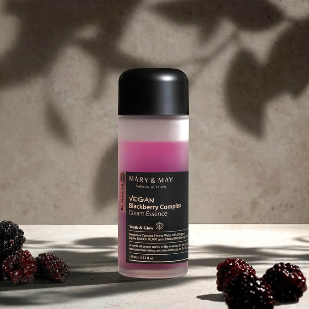 Mary&May Vegan Blackberry Complex Cream Essence on monivaikutteinen hoitotuote, joka yhdistää voiteen ravitsevuuden ja kasvoveden keveyden. Se ehkäisee ihon kuivumista ja kiristystä, palauttaa kosteustasapainon ja tekee ihosta pehmeän ja sileän. Tuote tasoittaa ihon pintaa, hidastaa ikääntymisen merkkejä ja suojaa tehokkaasti antioksidanttien avulla. Vegaaninen koostumus ei sisällä synteettisiä hajusteita tai eläinperäisiä ainesosia, ja ympäristöystävällinen pakkaus on valmistettu soijamusteella. Kaksivaiheinen, kermaisen kevyt rakenne imeytyy nopeasti ja jättää ihon raikkaaksi ilman tahmeaa tunnetta.