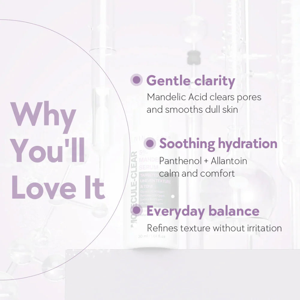 Nine Less Molecule-Clear 5% Mandelic Acid Serum — mieto 5 % mandelihapposeerumi, joka tasoittaa ihon sävyä, vähentää epäpuhtauksia ja tuo pitkäkestoista kosteutta.