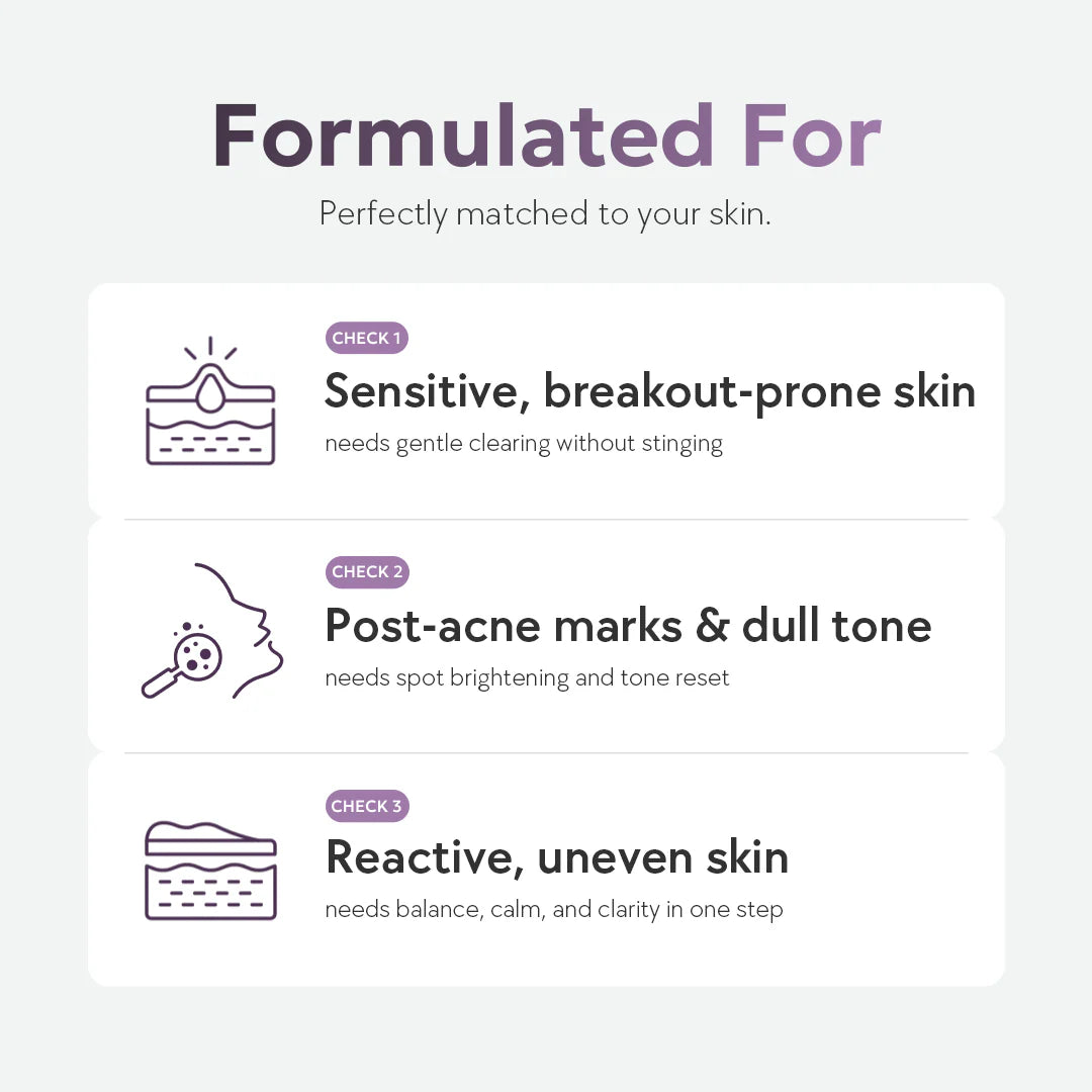 Koostumus on kehitetty erityisesti herkästi reagoivalle ja epäpuhtauksiin taipuvaiselle iholle. Mandelihappo toimii suuren molekyylikokonsa ansiosta hitaasti ja lempeästi, puhdistaen huokosia ja silottaen ihon pintaa ilman kirvelyä tai ärsytystä. Pantenoli, allantoiini, sorbitoli ja hyaluronihappo rauhoittavat ihoa, vahvistavat suojamuuria ja ylläpitävät optimaalista kosteustasapainoa samalla, kun AHA-kuorinta tekee tehtävänsä.