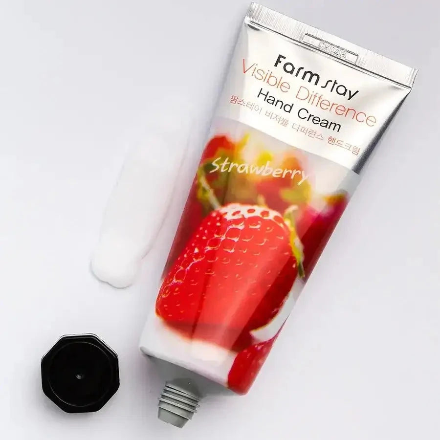 FarmStay Visible Difference Hand Cream Strawberry pehmentää, ravitsee ja kosteuttaa kädet, jättäen ne sileiksi ja miellyttävän tuoksuisiksi ilman tahmeutta.