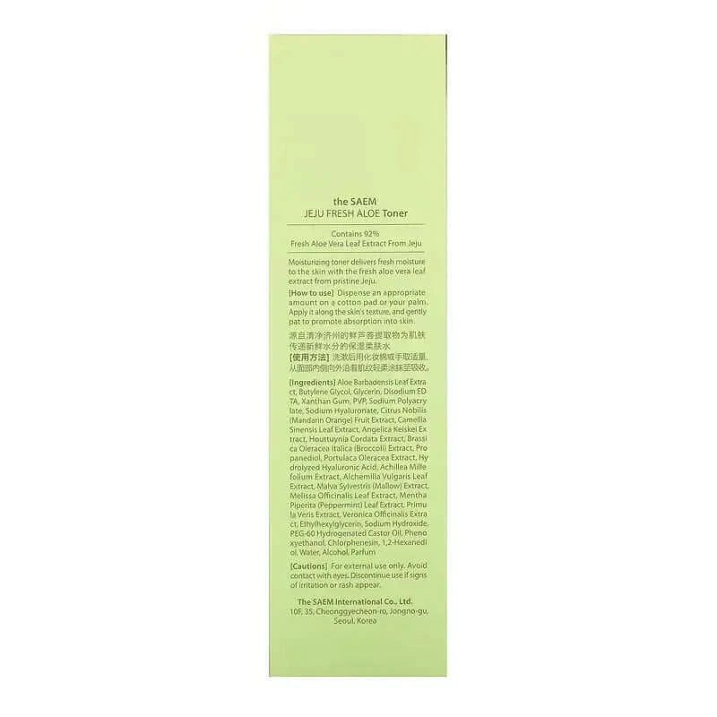 The Saem Jeju Fresh Aloe Toner sisältää Jejun saarelta peräisin olevaa aloe veraa ja tarjoaa intensiivistä kosteutusta. Tämän kasvoveden kevyt koostumus paitsi kosteuttaa tehokkaasti, myös supistaa huokosia, parantaa ihon kimmoisuutta ja edistää solujen uusiutumista. Se vahvistaa ihon suojakerrosta ulkoisia haittatekijöitä vastaan.