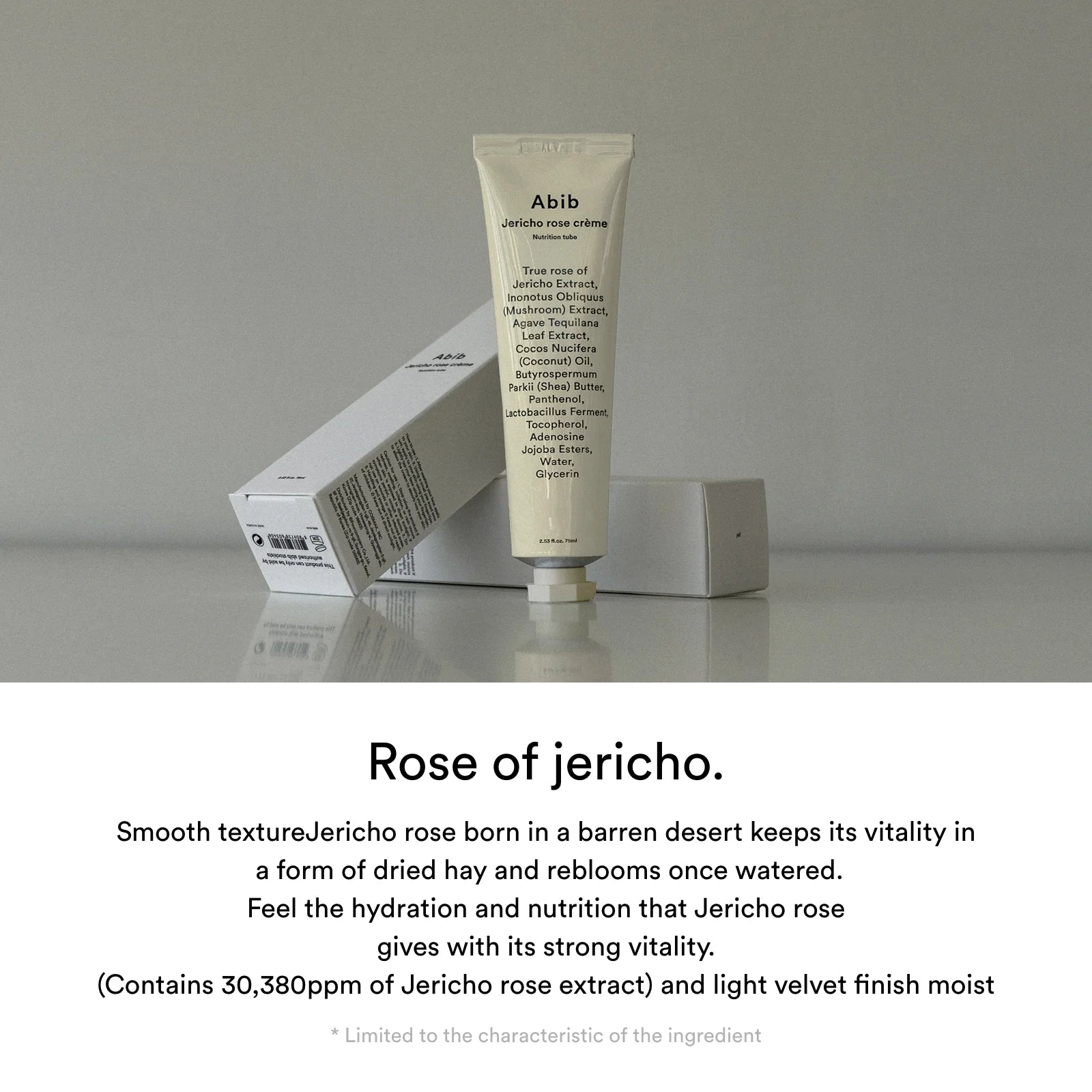 Abib Jericho Rose Cream Nutrition Tube on ravitseva kasvovoide, joka syväkosteuttaa ja elvyttää väsynyttä, elottoman näköistä ihoa. Jerikon ruusun uute palauttaa ihon kosteuden ja lipidien tasapainon, antaen sille uutta elinvoimaa sekä parantaen sen sävyä ja rakennetta.