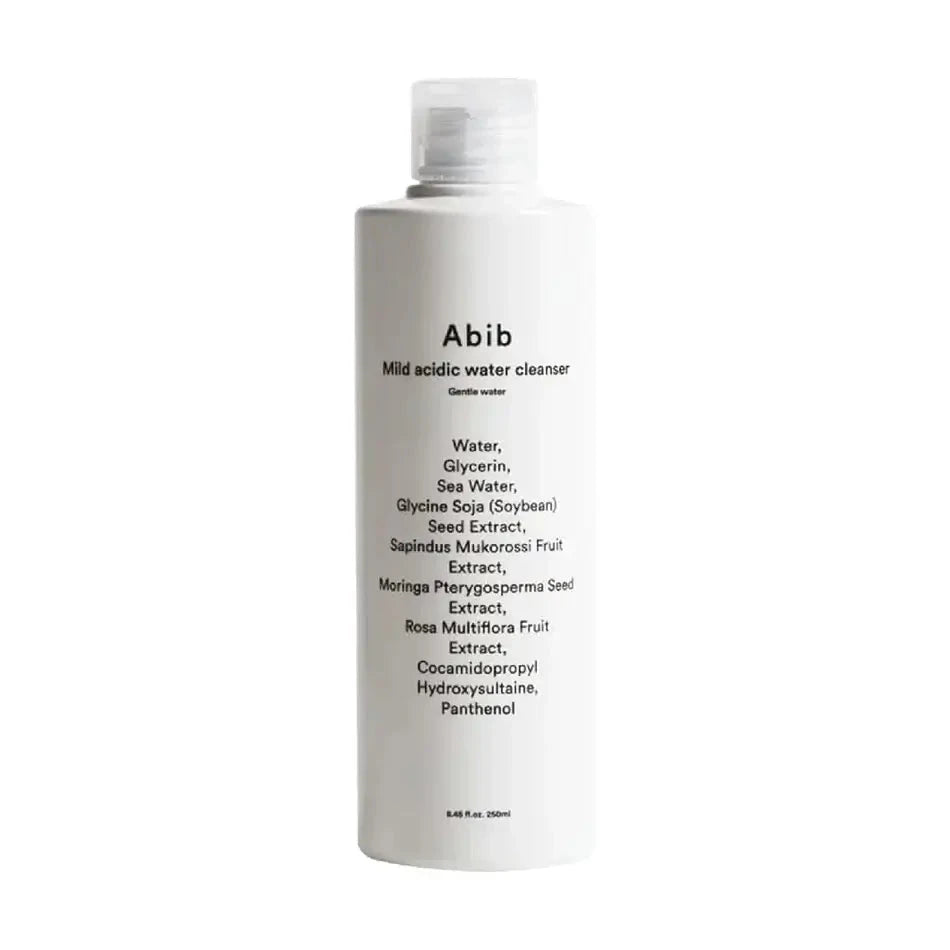 Abib Mild Acidic Water Cleanser Gentle Water on mieto ja tasapainottava puhdistusvesi, joka poistaa epäpuhtaudet ja meikin jättäen ihon kosteutetuksi ja raikkaaksi.