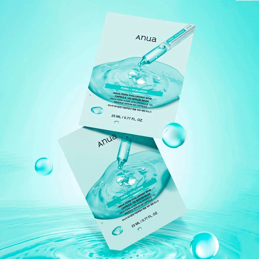 Anua PDRN Hyaluronic Acid Capsule 100 Serum Mask on tehokkaasti kosteuttava kangasnaamio, joka ravitsee ihoa, palauttaa sen suojakerroksen ja antaa heleän, kimmoisan lopputuloksen.