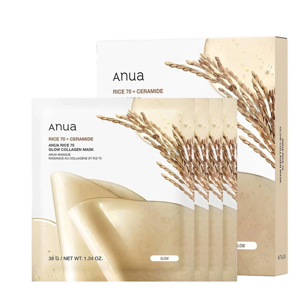 Anua Rice 70 Glow Collagen Mask on ihoa elvyttävä, kosteuttava ja silottava hydrogeelinaamio, joka luo "glass skin" -efektin.