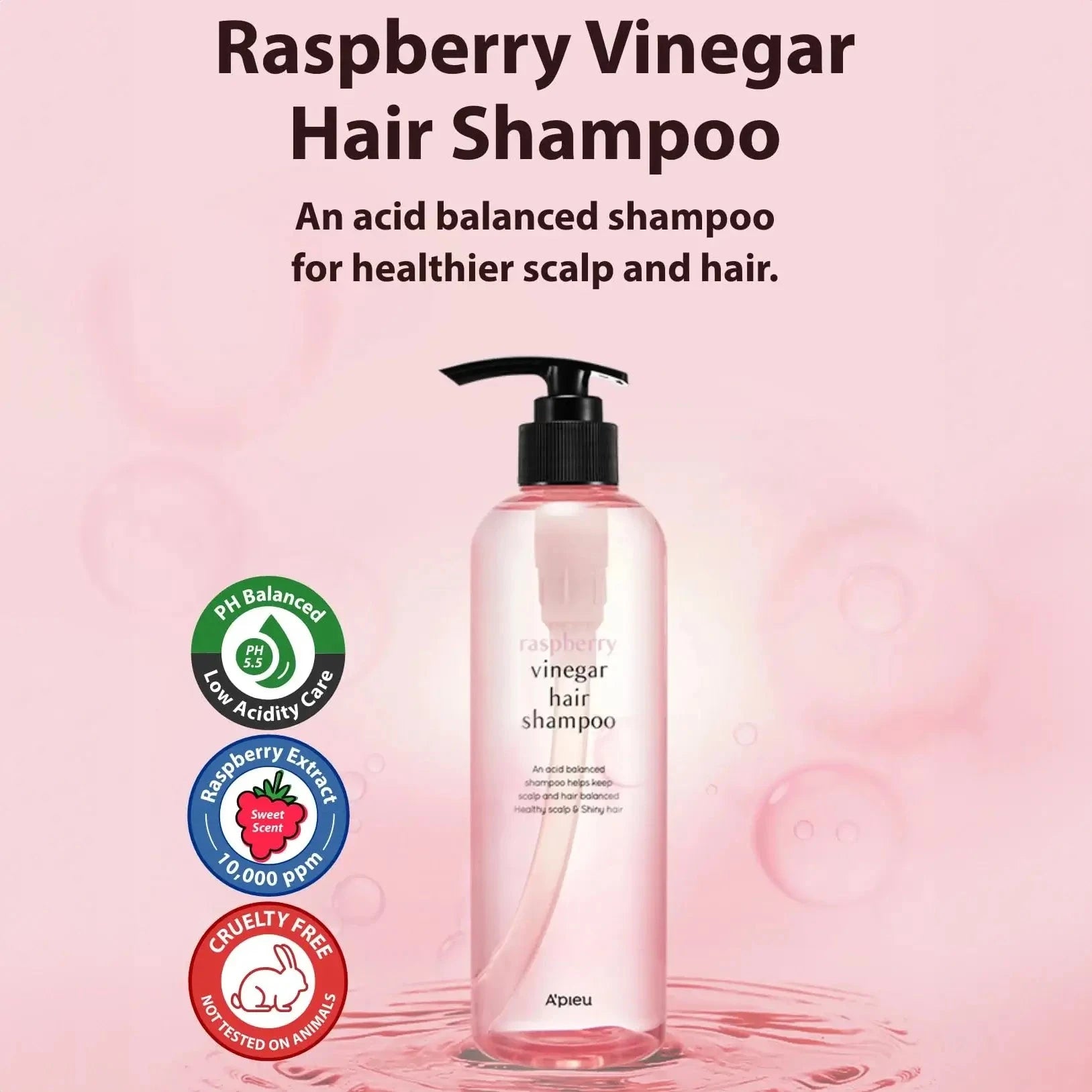 A’Pieu Raspberry Vinegar Shampoo on vadelmaetikkaa sisältävä shampoo, joka palauttaa hiuspohjan pH-tasapainon, vähentää kuivuutta ja tekee hiuksista sileät ja kiiltävät.