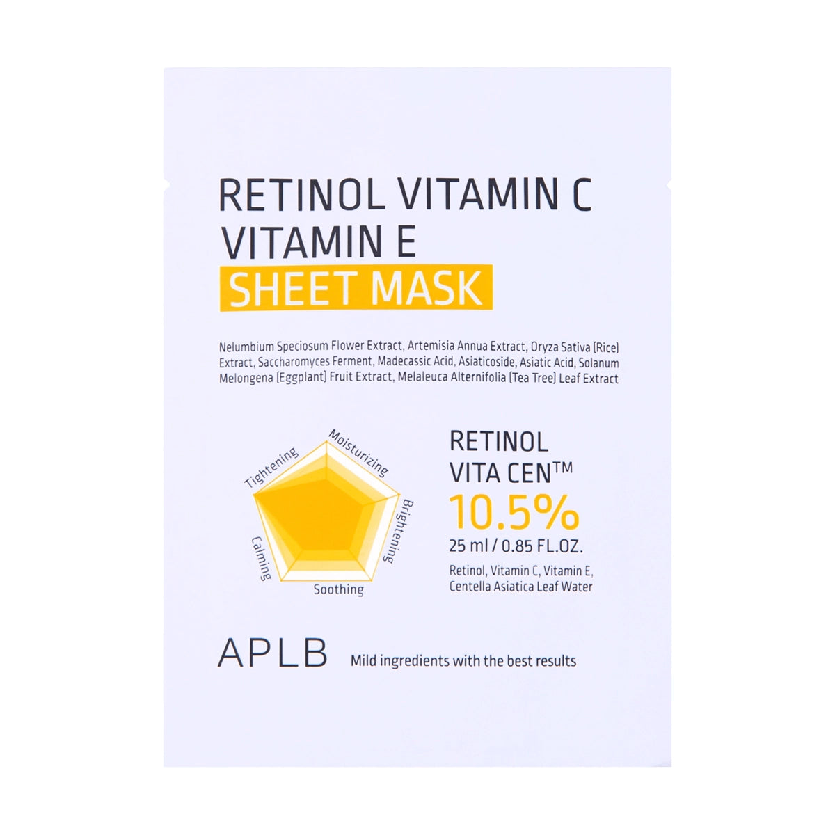 APLB Retinol Vitamin C Vitamin E Sheet Mask — kosteuttava ja kirkastava kangasnaamio, jossa yhdistyvät retinoli, C- ja E-vitamiinit. Tekee ihosta pehmeän, heleän ja elinvoimaisen.