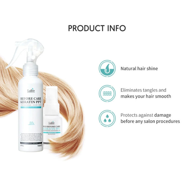 Lador Before Keratin PPT on tehokas keratiinisuihke, joka täyttää vaurioituneet kohdat, vahvistaa hiuksia ja suojaa niitä käsittelyn aikana.