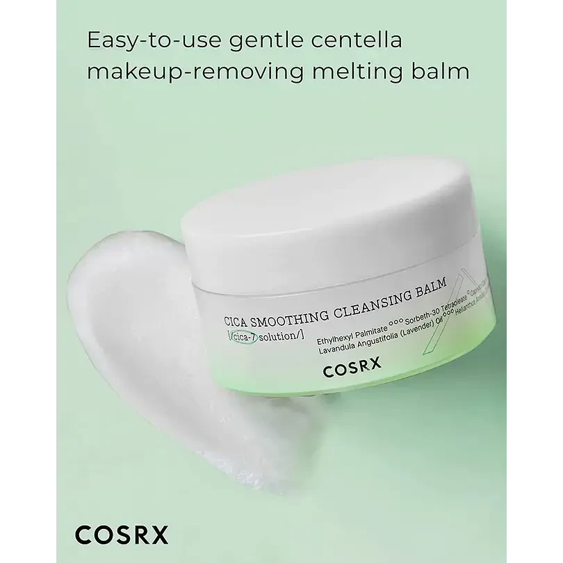 COSRX Pure Fit Cica Smoothing Cleansing Balm, obogaćen centellalla ja kasviöljyillä, puhdistaa ihoa hellävaraisesti aiheuttamatta ärsytystä. Se poistaa tehokkaasti meikin, rauhoittaa ja kosteuttaa ihoa ainutlaatuisen koostumuksensa ansiosta, jossa on 61,2 % Cica-7 Complex -yhdistettä ja seitsemän kasviöljyä. Tuotteella on sorbettimainen koostumus, joka muuttuu öljyksi ja sitten maidoksi, huuhtoutuen helposti vedellä.