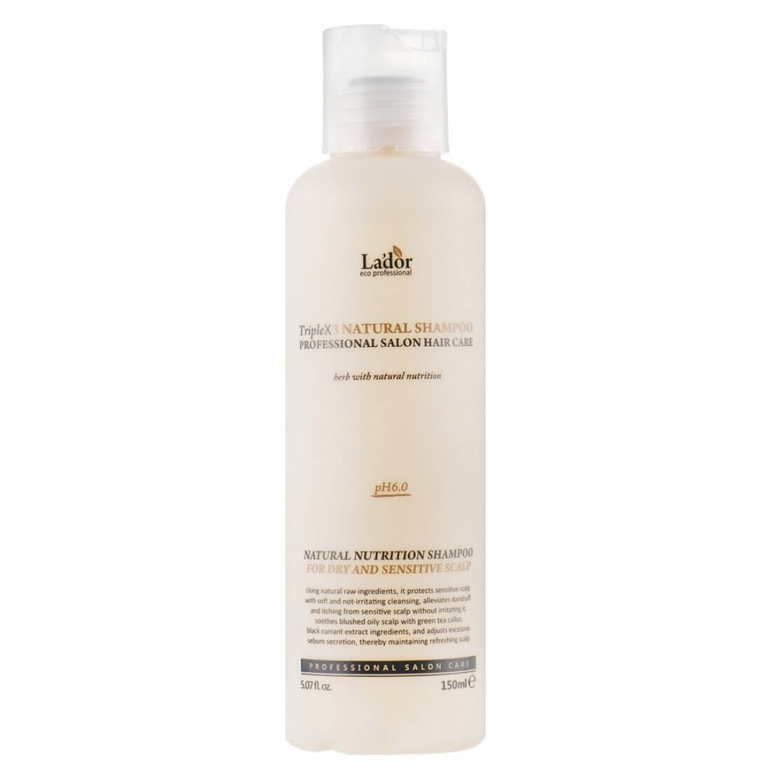 Lador Triplex Natural Shampoo on sulfaatiton, eteerisiä öljyjä sisältävä luonnollinen shampoo, joka puhdistaa hiukset hellästi ja tasapainottaa hiuspohjan.