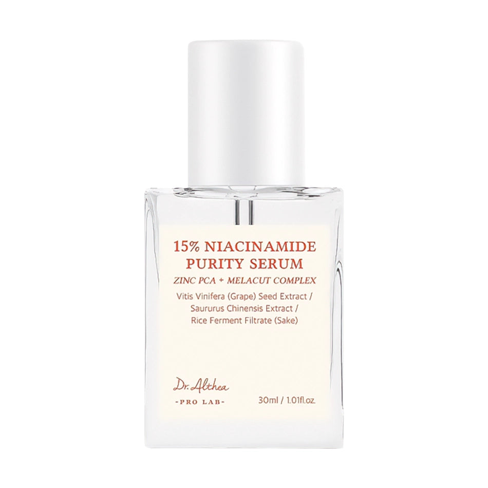 Dr. Althea Niacinamide Purity Serum on kevyt, geelimäinen kirkastava seerumi, joka tasoittaa ihon sävyä ja palauttaa sen terveen hehkun. Se ehkäisee pigmenttimuutoksia ja postakne-jälkiä sekä lievittää tulehduksia antibakteerisilla ominaisuuksillaan.
