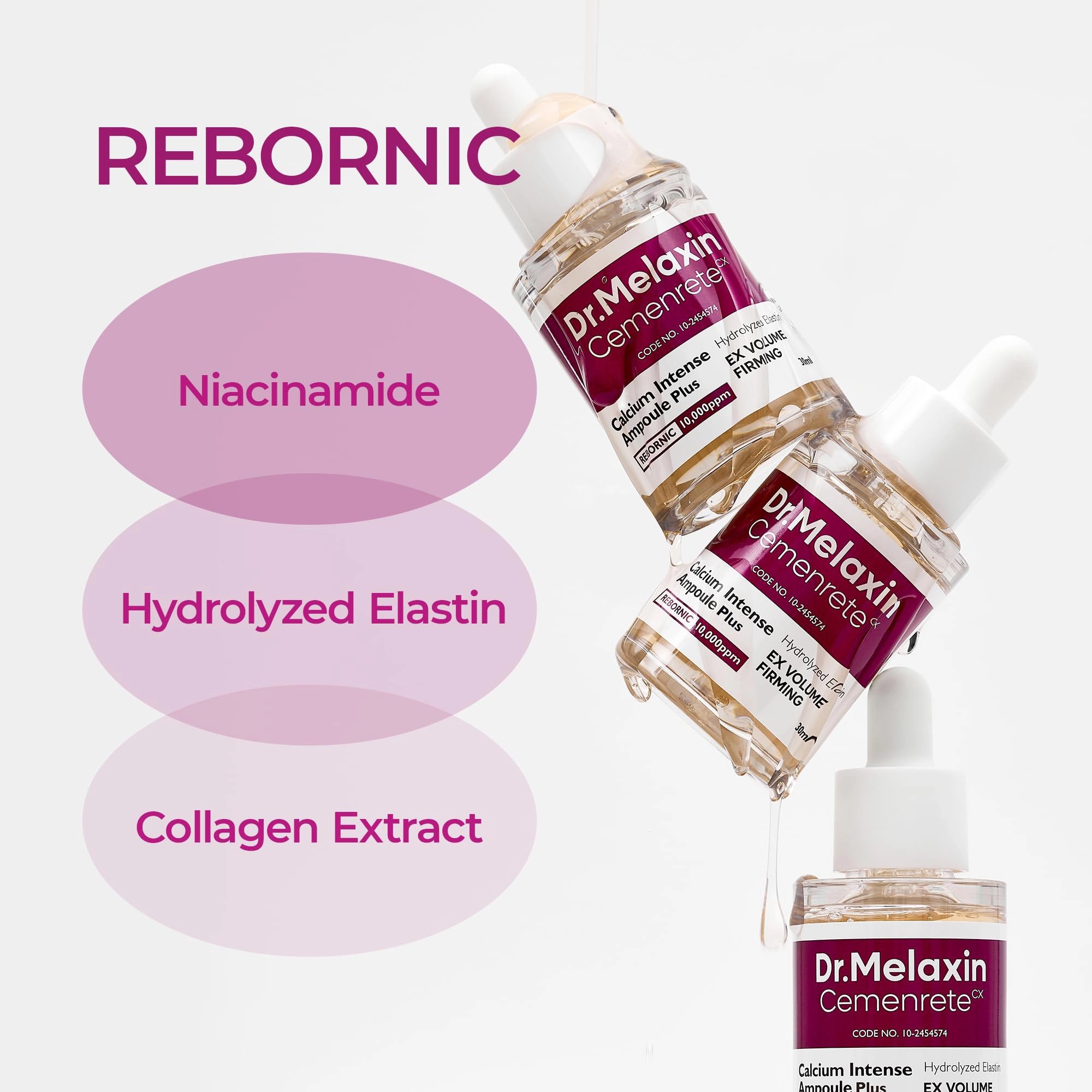 Intensīvais serums Dr. Melaxin Cemenrete Calcium Volume Ampoule Plus paredzēts cīņai ar ādas novecošanās pazīmēm ap acīm. Tā sastāvā ir iekļauts patentētais REBORNIC, kurš, kombinācijā ar D vitamīnu pastiprina jonizētā kalcija uzsūkšanos, palīdz aizkavēt kolagēnu un elastīnu plakstiņu zonā.