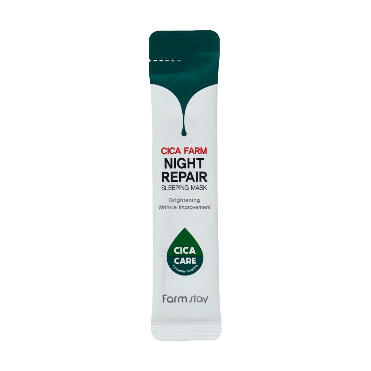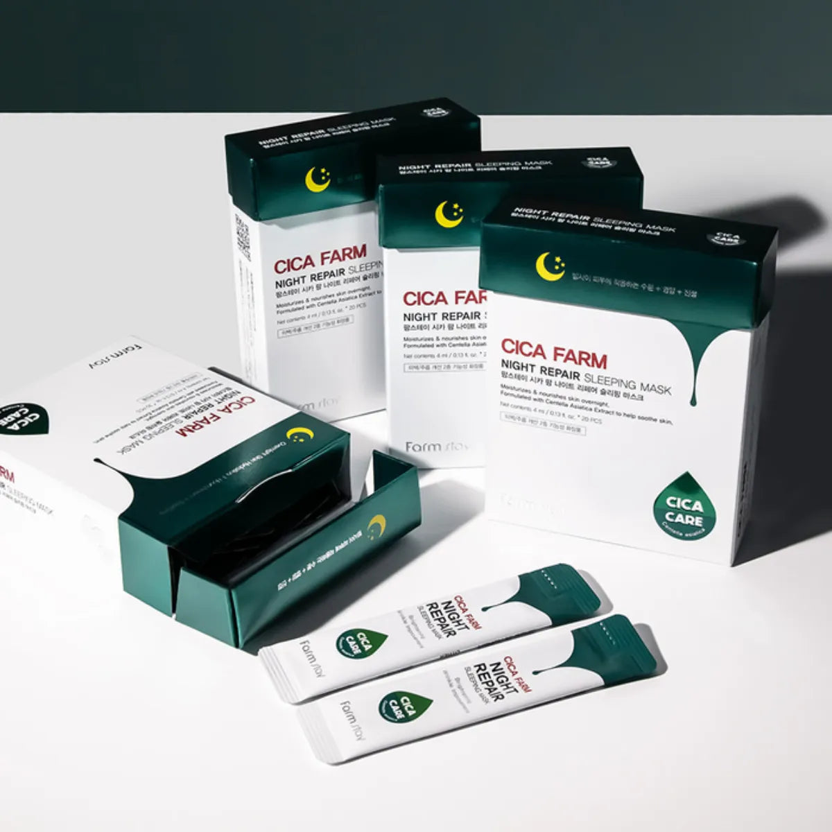 Farmstay Cica Farm Night Repair Sleeping Mask — yönaamio Aasian centella -uutteella, joka kosteuttaa, rauhoittaa ja uudistaa ihoa yön aikana.