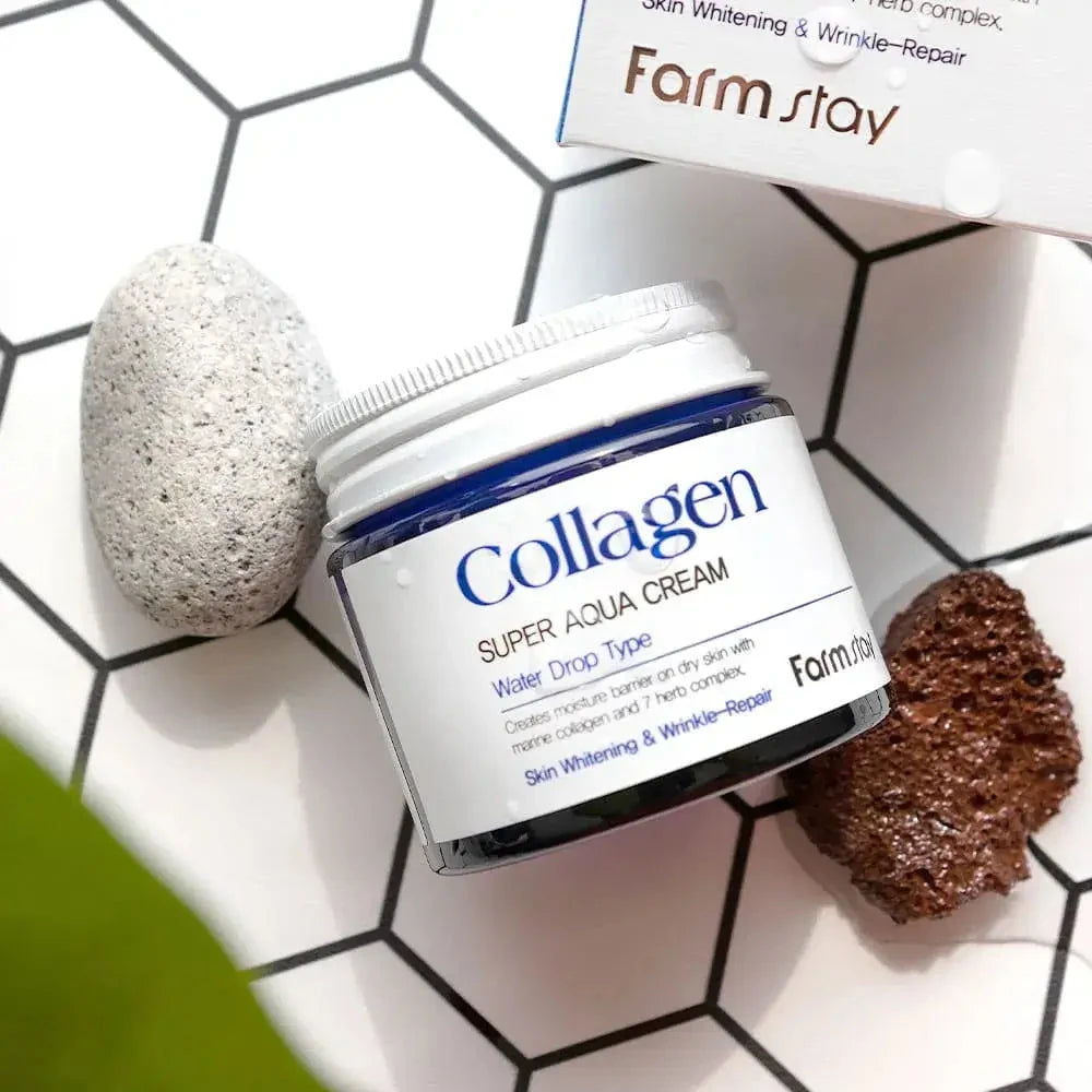 FarmStay Collagen Super Aqua Cream on tehokkaasti kosteuttava kasvovoide, joka vahvistaa ihon kimmoisuutta ja tekee siitä sileän ja heleän.