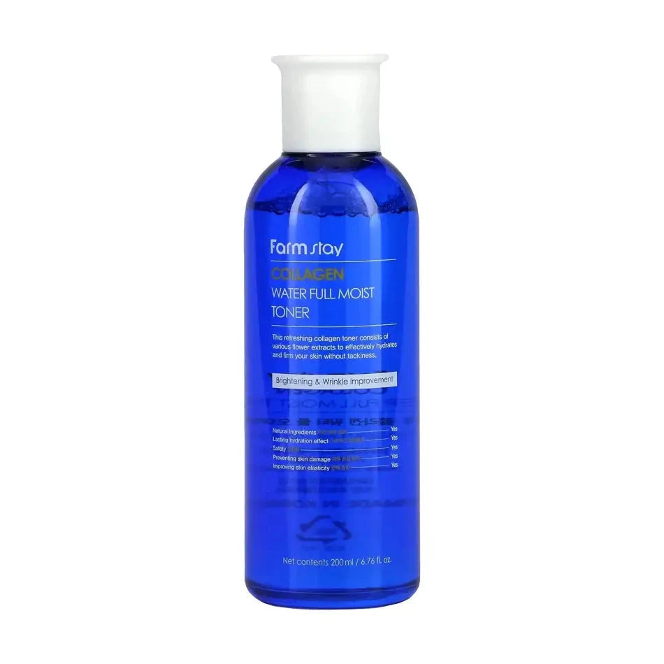FarmStay Collagen Water Full Moist Toner on intensiivisesti kosteuttava kasvovesi, joka palauttaa ihon kimmoisuuden ja tasapainon jättäen sen raikkaaksi ja pehmeäksi.