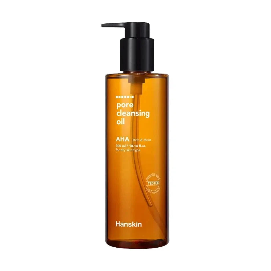 Hanskin Pore Cleansing Oil AHA hellävarainen puhdistusöljy poistaa meikin ja kuolleet ihosolut sekä puhdistaa ihohuokoset tehokkaasti.
