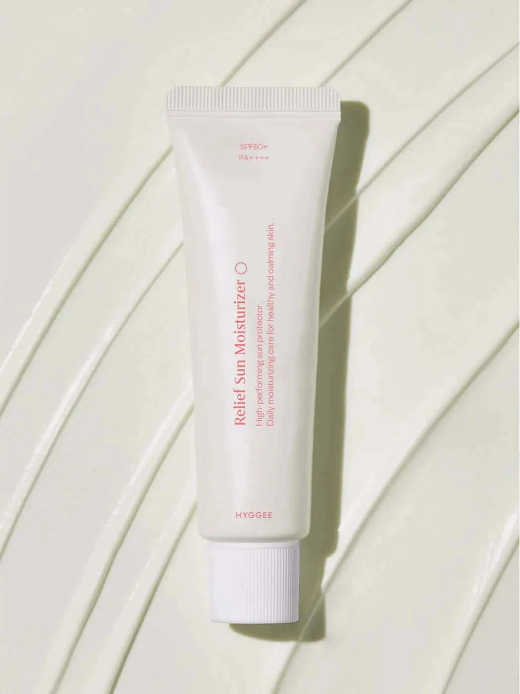 Hyggee Relief Sun Moisturizer SPF50+ PA++++ kosteuttava ja ihoa rauhoittava aurinkovoide, joka tarjoaa erittäin korkean suojan UVA- ja UVB-säteitä vastaan.