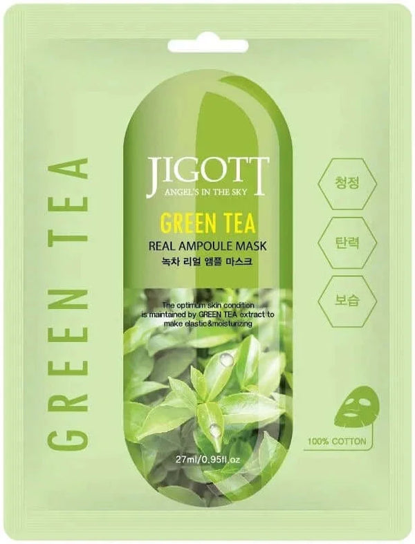 Jigott Real Ampoule Mask kosteuttaa, rauhoittaa ja elvyttää ihoa kuudella eri vaihtoehdolla, tarjoten optimaalista hoitoa kaikille ihotyypeille.