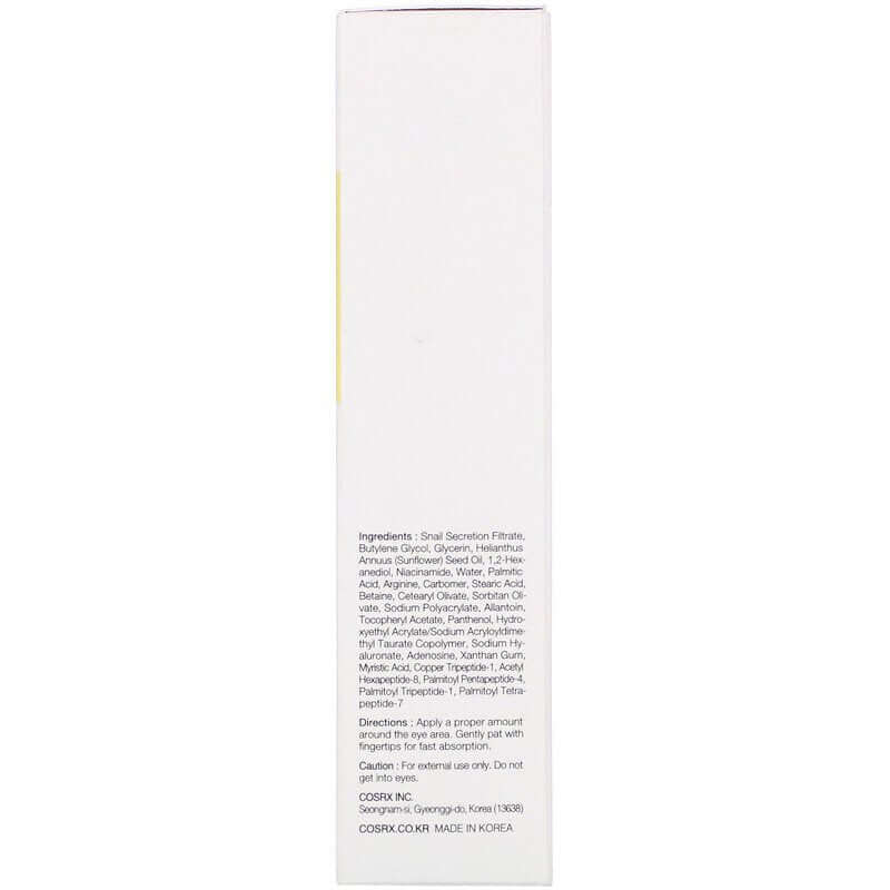 COSRX Advanced Snail Peptide Eye Cream sisältää 72 % etanaseerumia ja peptidejä, jotka taistelevat ikääntymisen merkkejä vastaan, parantavat ihon kimmoisuutta ja elastisuutta. Tämä voide vähentää turvotusta, kirkastaa tummia silmänalusia ja kosteuttaa sekä ravitsee silmänympärysihoa. Se stimuloi uudistumista, rauhoittaa tulehduksia ja tekee ihosta sileämmän ja heleämmän.
