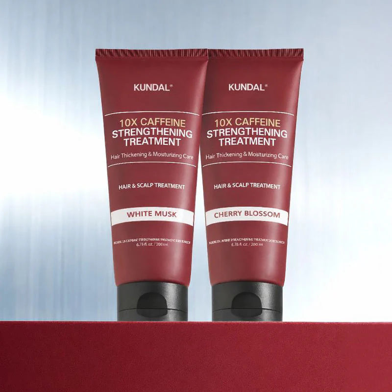Kundal 10X Caffeine Strengthening Treatment Cherry Blossom on kermainen hoitotuote hiuksille ja hiuspohjalle, joka auttaa vähentämään katkeilua ja tukee vahvempaa, tiheämpää hiustuntumaa.