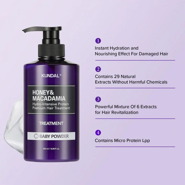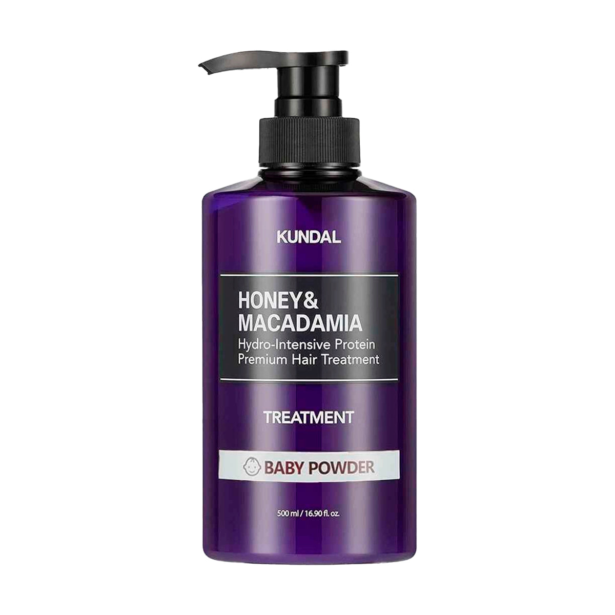 KUNDAL Honey & Macadamia Protein Treatment Baby Powder — intensiivinen proteiineja sisältävä hoito, joka ravitsee ja palauttaa hiukset, tehden niistä pehmeät ja kiiltävät.