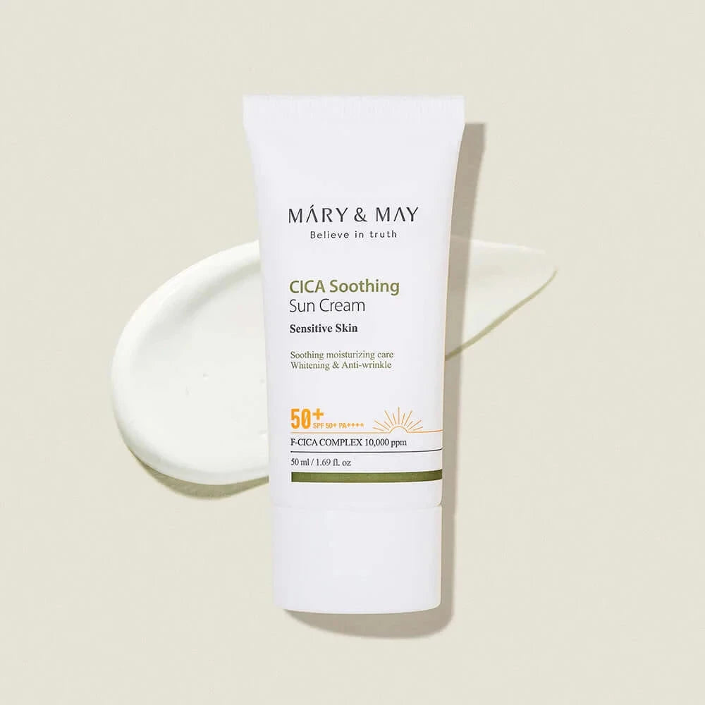 Mary&May CICA Soothing Sun Cream SPF 50+ PA++++ on rauhoittava ja kosteuttava aurinkovoide, joka suojaa ihoa tehokkaasti UVA- ja UVB-säteiltä. Kevyt, ilmava koostumus imeytyy nopeasti ja tuntuu huomaamattomalta iholla, jättäen sen pehmeäksi ja raikkaaksi. Centella Asiatica -uute rauhoittaa ärsytystä, niacinamidi kirkastaa ihoa, adenosiini tukee ihon kimmoisuutta ja hyaluronihappo kosteuttaa syvältä. Vegaaninen koostumus sisältää uusimman sukupolven fotostabiileja kemiallisia suodattimia, jotka tarjoavat luotettavan ja pitkäkestoisen suojan.