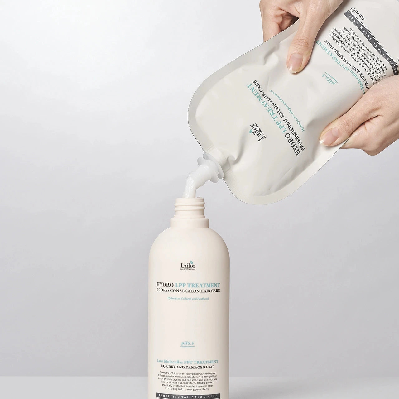 Lador Hydro LPP Treatment on intensiivisesti kosteuttava ja rakennetta korjaava hoitoaine, joka vahvistaa kuivia ja käsiteltyjä hiuksia.