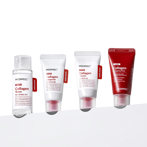 Medi-Peel Red Lacto Collagen Skin Care Trial Kit kiinteyttää, kosteuttaa ja uudistaa ihoa, palauttaen sen kimmoisuuden ja nuorekkaan hehkun.
