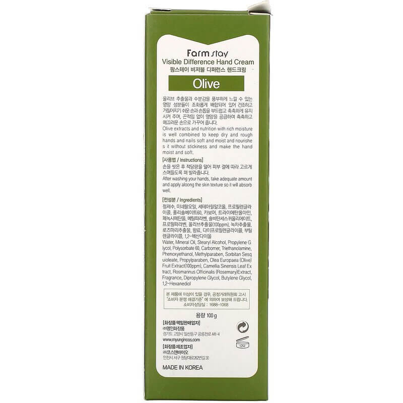 FarmStay Visible Difference Hand Cream Olive ravitsee, kosteuttaa ja suojaa ihoa tehden käsistä pehmeät, sileät ja hyvin hoidetut ilman tahmeutta.