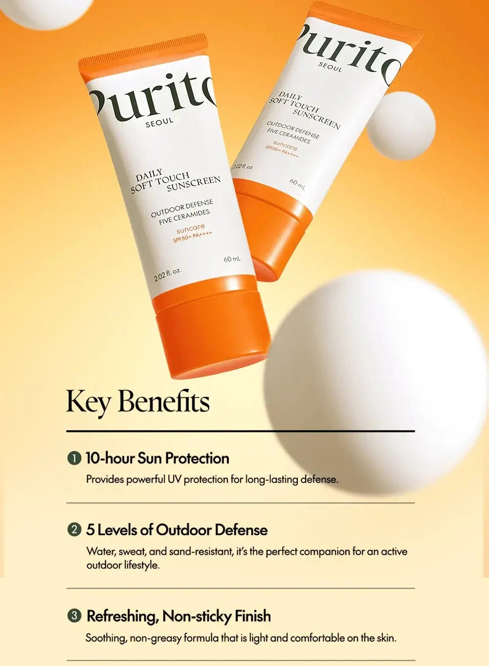 Purito Daily Soft Touch Sunscreen SPF50+ PA++++ on uuden sukupolven aurinkosuojavoide, jossa on korkea suojaustaso ja höyhenenkevyt koostumus. Se suojaa ihoa tehokkaasti UVA- ja UVB-säteiltä neljän fotostabiilin suodattimen avulla. Parantaa ihon kuntoa, vahvistaa lipidisuojaa ja ehkäisee pigmenttiläiskiä, edistäen ihon nuorekkuutta ja kimmoisuutta. Voide imeytyy nopeasti, ei jätä tahmeaa tunnetta eikä valkoisia jälkiä, ja toimii erinomaisesti meikin pohjana.