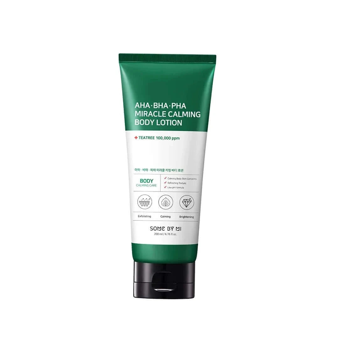 Some By Mi AHA-BHA-PHA Miracle Calming Body Lotion sisältää patentoitua Truecica™-kompleksia, johon kuuluu 92 % centella asiatica -uutetta, asiaticoside, madecassoside, madecassohappo ja asiatic-happo – tehokkaita ainesosia aknen, epäpuhtauksien ja ihoärsytyksen hoitoon.