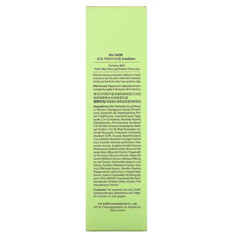 The Saem Jeju Fresh Aloe Emulsion sisältää 86 % Jejun saarelta peräisin olevaa aloe veraa ja tarjoaa intensiivistä kosteutusta sekä rauhoittavaa vaikutusta iholle. Kevyt emulsio virkistää ja viilentää ihoa, lievittää ärsytystä, vähentää hilseilyä ja suojaa ulkoisilta haittatekijöiltä, mukaan lukien UV-säteilyltä.