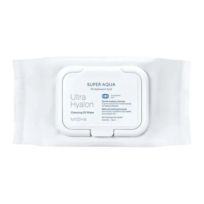 Missha Super Aqua Ultra Hyaluron Cleansing Oil Wipes ovat öljypohjaiset puhdistusliinat, jotka poistavat meikin ja epäpuhtaudet hellävaraisesti samalla kun kosteuttavat ihoa.