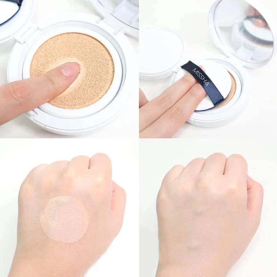 - Paina kevyesti sientä saadaksesi sopivan määrän Missha Magic Cushion Cover Lasting SPF50+ PA+++ -meikkivoidetta.